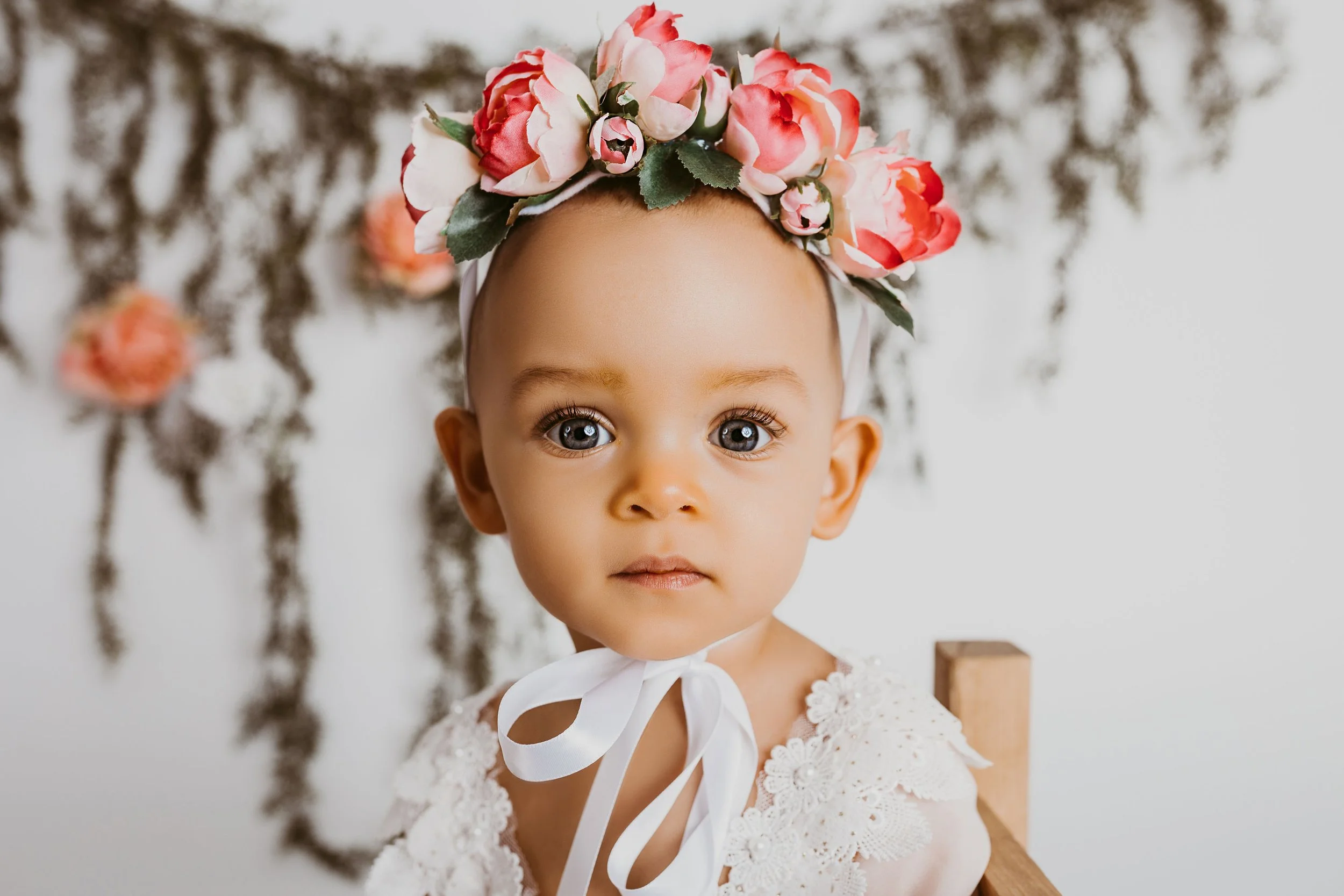A floral-themed cake smash adds a soft, whimsical feel to the session. Delicate flowers, greenery, and a beautiful cake create a charming garden-inspired setup.