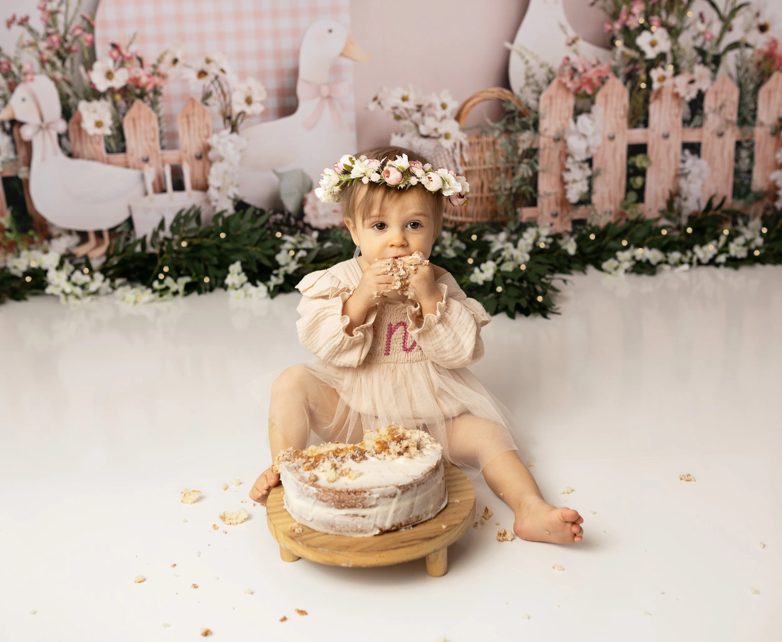 The Silly Little Goose theme is one of the cutest and most lighthearted themes for a first birthday session. With soft colors, playful details, and a sweet little cake ready to be smashed, the entire setup created the perfect environment for capturing genuine smiles and curious little moments.